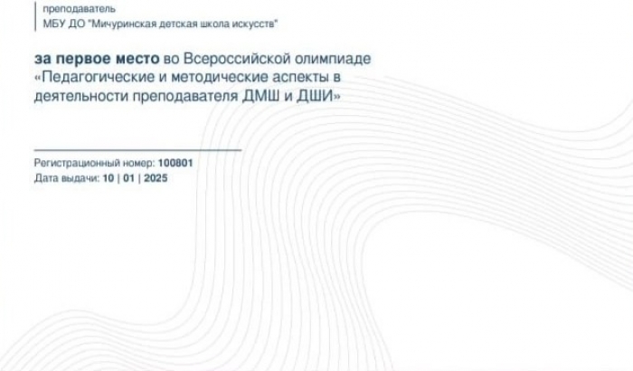 Преподаватель Мичуринской детской школы искусств О.В. Хромова успешно выступила на Всероссийской Олимпиаде "Педагогические и методические аспекты в деятельности преподавателей ДМШ и ДШИ" (12+).