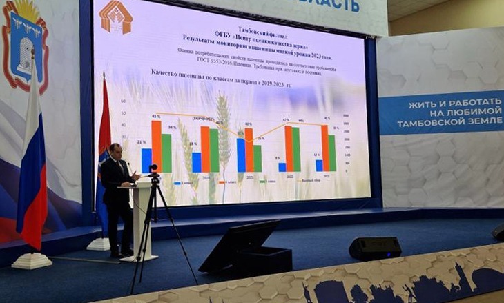 На пленарном заседании директор Тамбовского филиала ФГБУ «Центр оценки качества зерна» Теймур Айдамиров рассказал о целях и задачах государственного мониторинга зерна в этом году, а также результатах качества регионального зерна урожая 2023 года.