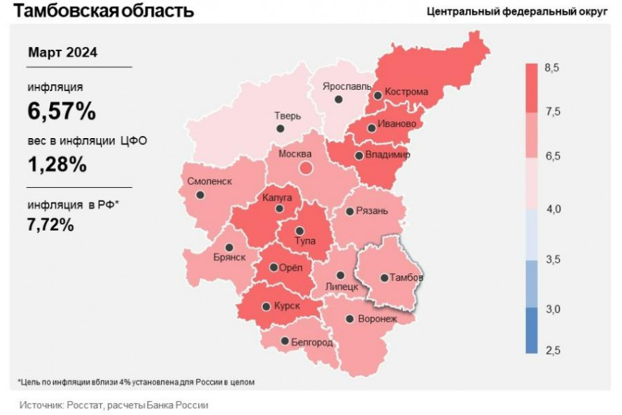 Годовая инфляция в Тамбовской области в марте снизилась на 0,11% - до 6,57% после 6,68% в предыдущем месяце.