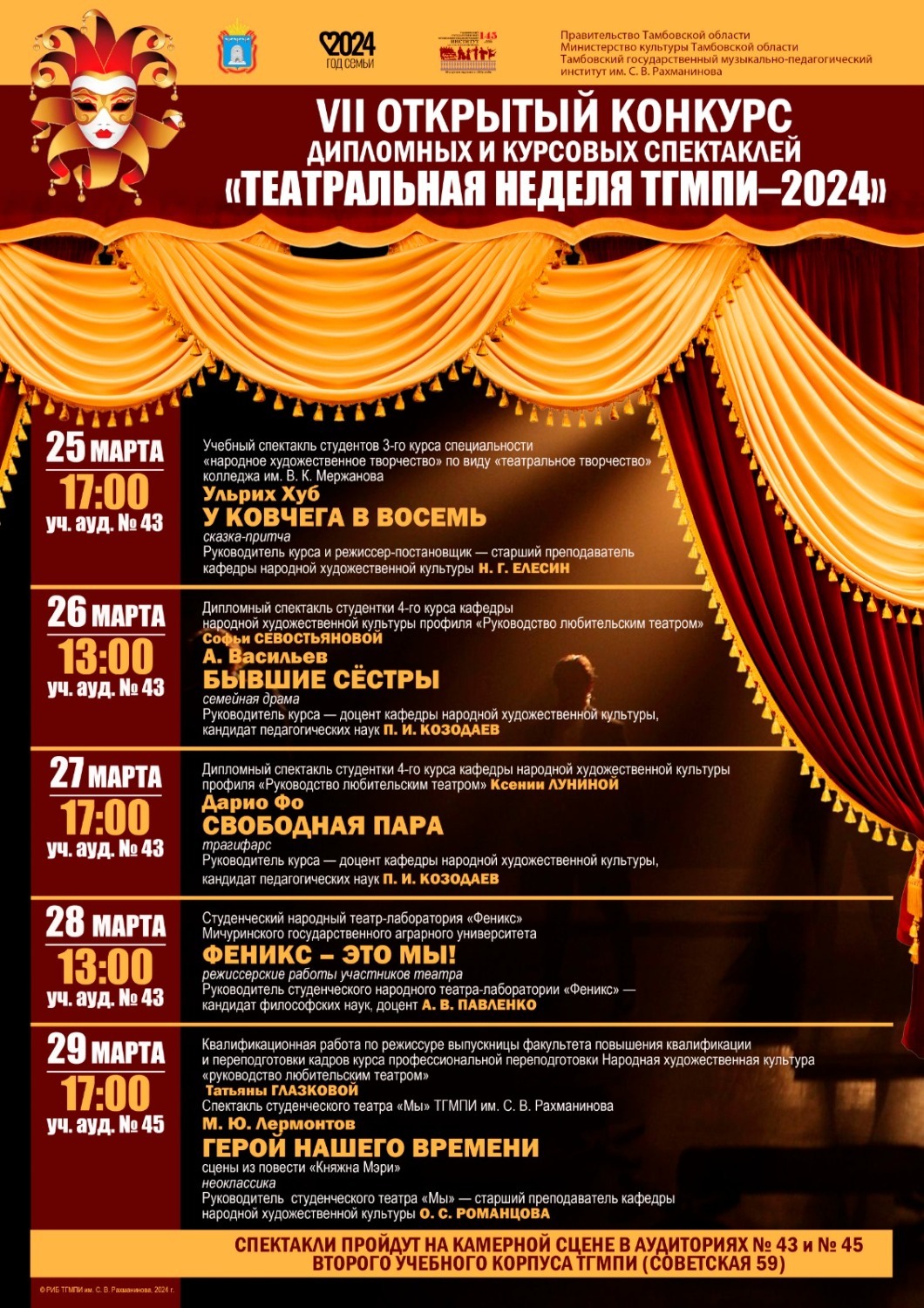 В ТГМПИ им. С. В. Рахманинова с 25 по 29 марта пройдет VII Открытый конкурс дипломных и курсовых спектаклей «Театральная неделя ТГМПИ-2024» (16+). Он традиционно проводится в канун Всемирного дня театра. Студенты, обучающиеся на кафедре народной художественной культуры, на четвертом курсе должны самостоятельно поставить спектакль. Эти постановки и становятся предметом зрительских обсуждений и профессионального анализа жюри.