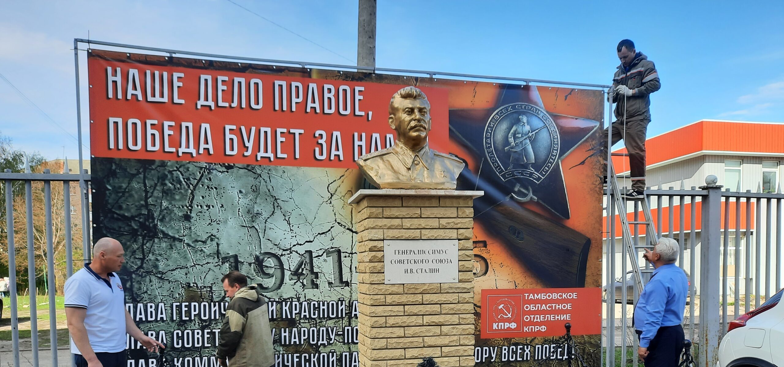 Активно в этом секретарям обкома помогли и сторонники КПРФ, которые провели сварочные работы по укреплению несущего каркаса, на который был вывешен новый баннер, прославляющий великий подвиг Победы советского народа в войне с фашистской Германией и ее сателлитами.