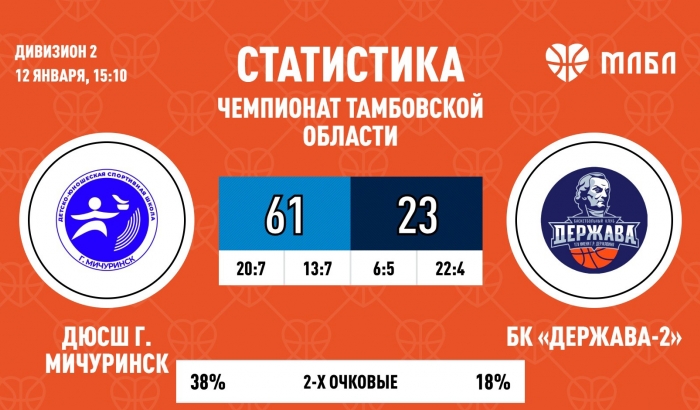 Завершилась игра МЛБЛ | Россия Чемпионата Тамбовской области по баскетболу среди мужских команд сезона 2024-2025 (6+) между командами 2-го дивизиона «ДЮСШ г. Мичуринск» и БК «Держава-2». Встреча завершилась со счетом 61:23 в пользу мичуринцев.