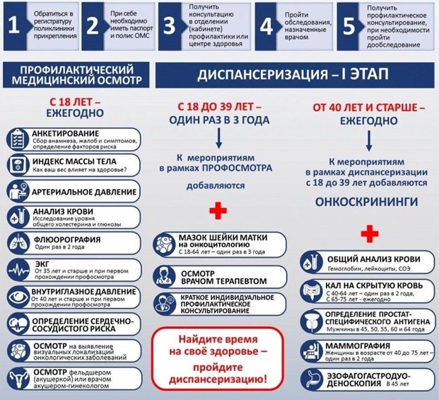 Почти все приобретенные болезни на ранних стадиях проходят бессимптомно, поэтому, чем раньше удается обнаружить исходные проявления заболевания или риск их развития, тем успешнее станет выздоровление. Как раз для подобных целей и проводится диспансеризация, которая кроме раннего выявления заболеваний и их факторов риска гарантирует проведение важных профилактических мер, и, при надобности, долговременное диспансерное наблюдение.